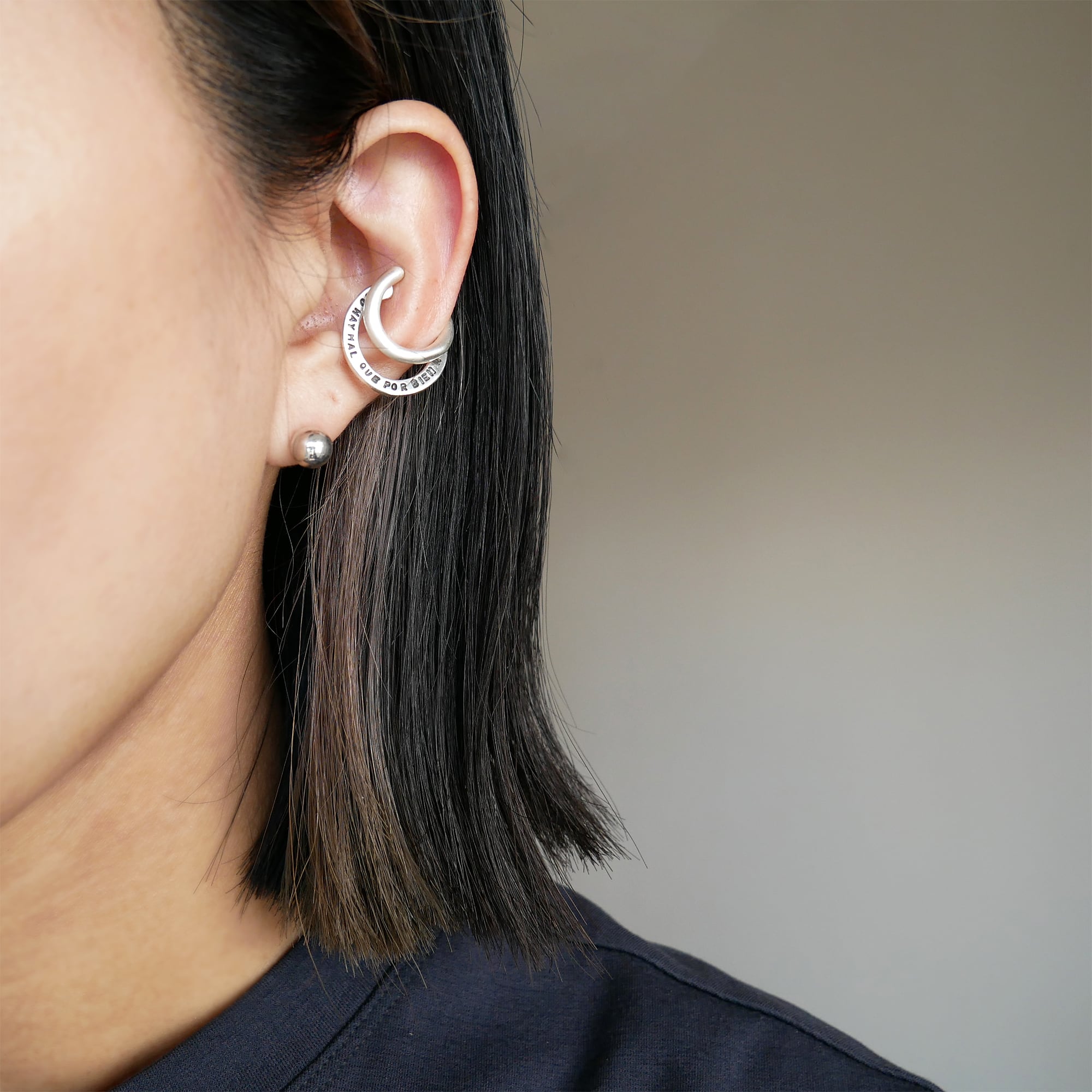 お耳の形状にも影響を受けますが当店の他のデザインに比べ少し上の方でつけて頂きやすいデザインとなっております。他のイヤカフやピアスなどとの重ね付けでレイヤードのバリエーションが広がります。