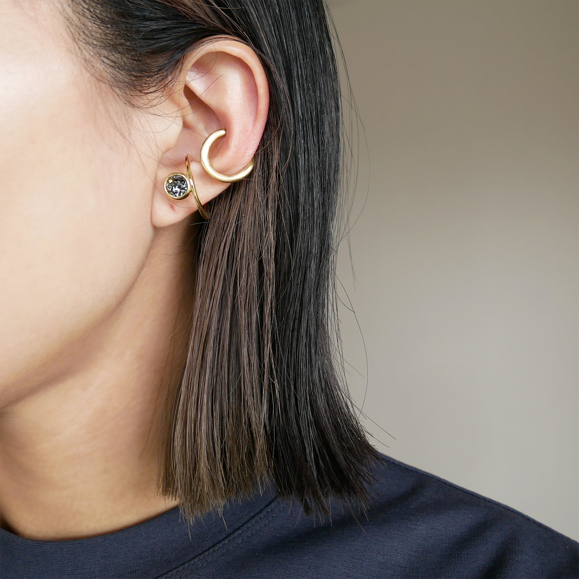お耳の形状にも影響を受けますが当店の他のデザインに比べ少し上の方でつけて頂きやすいデザインとなっております。他のイヤカフやピアスなどとの重ね付けでレイヤードのバリエーションが広がります。
