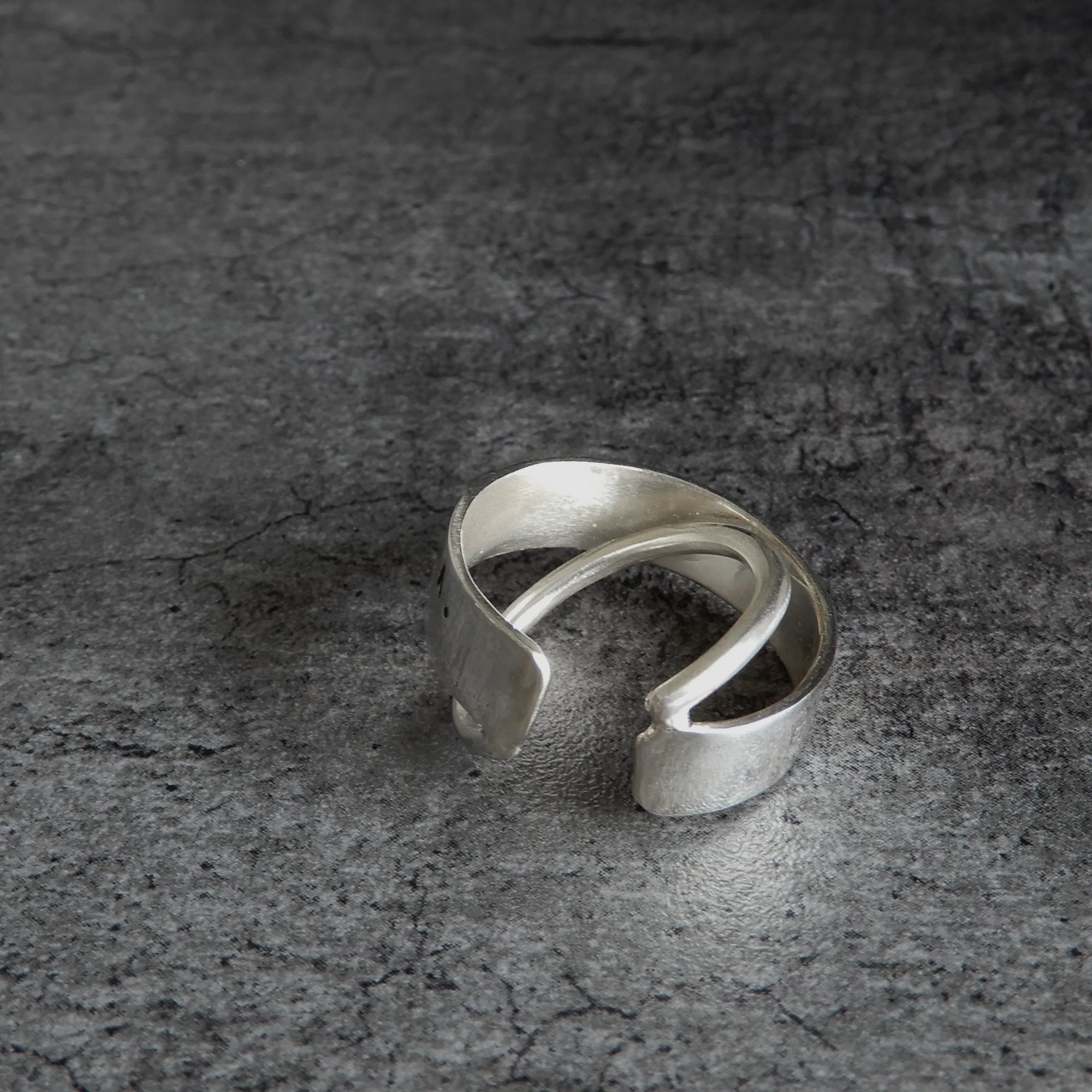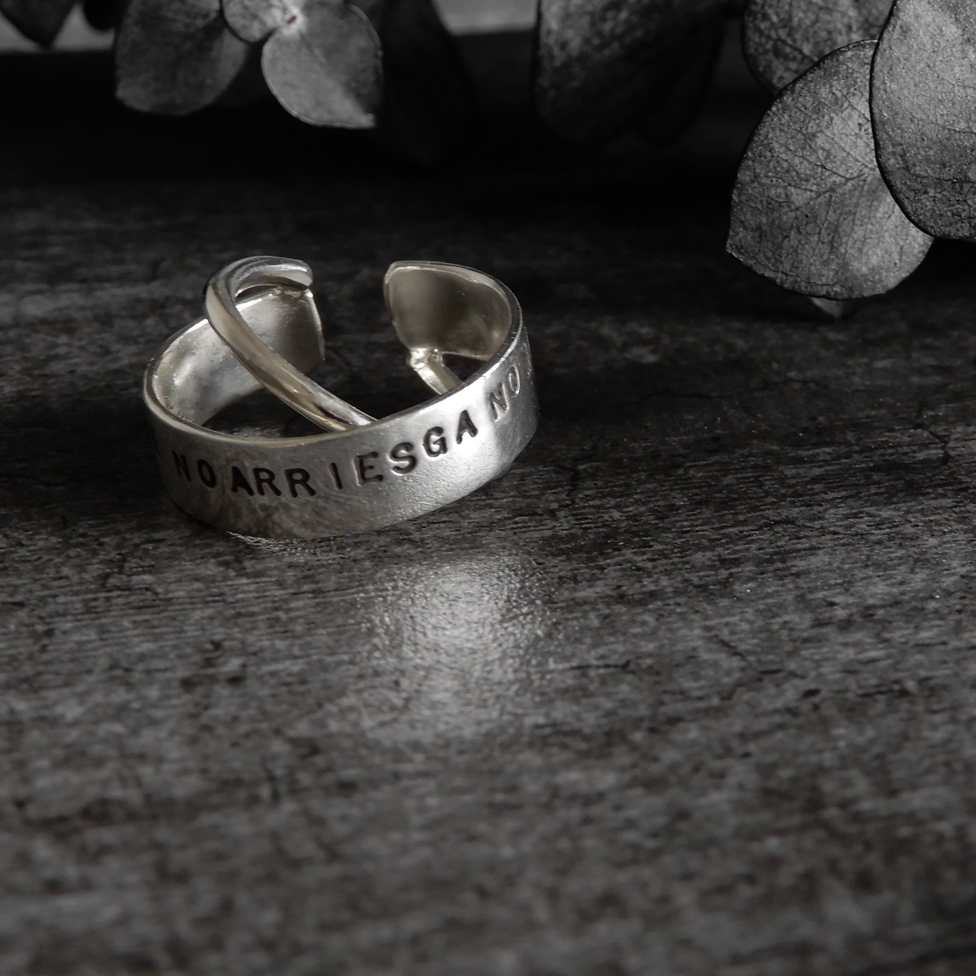 というスペイン語のフレーズが刻まれた平打ちリングにの内側に丸線をクロスさせたデザイン。