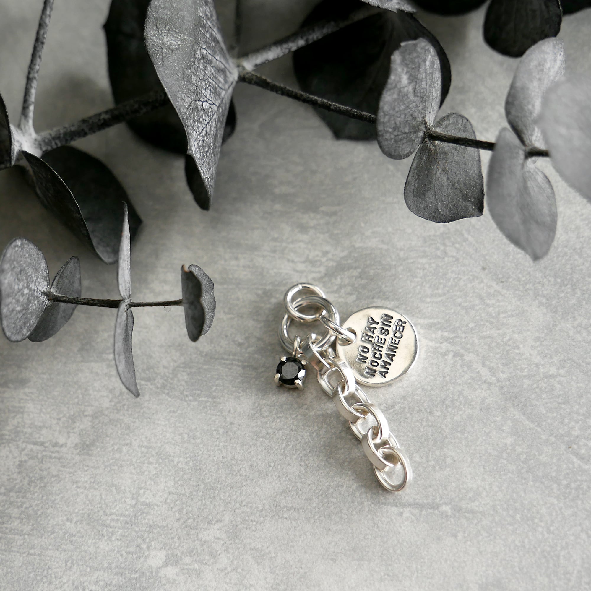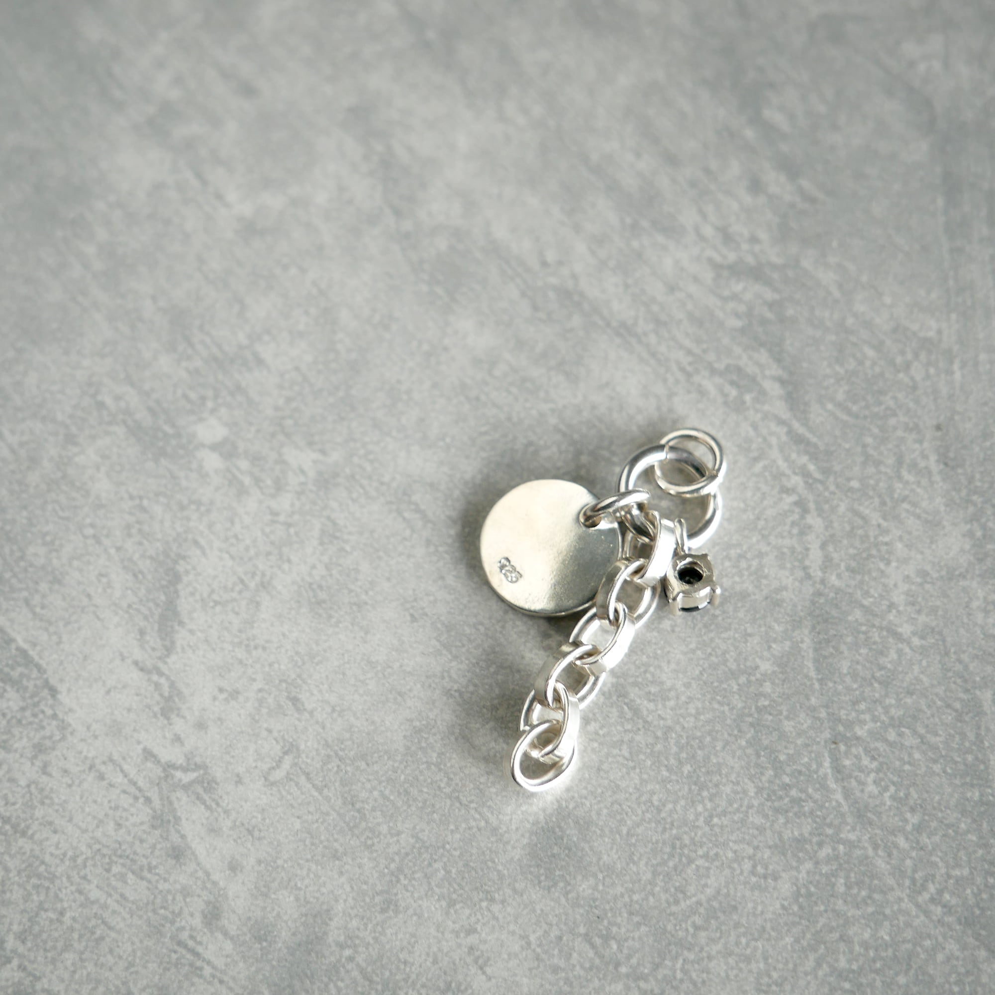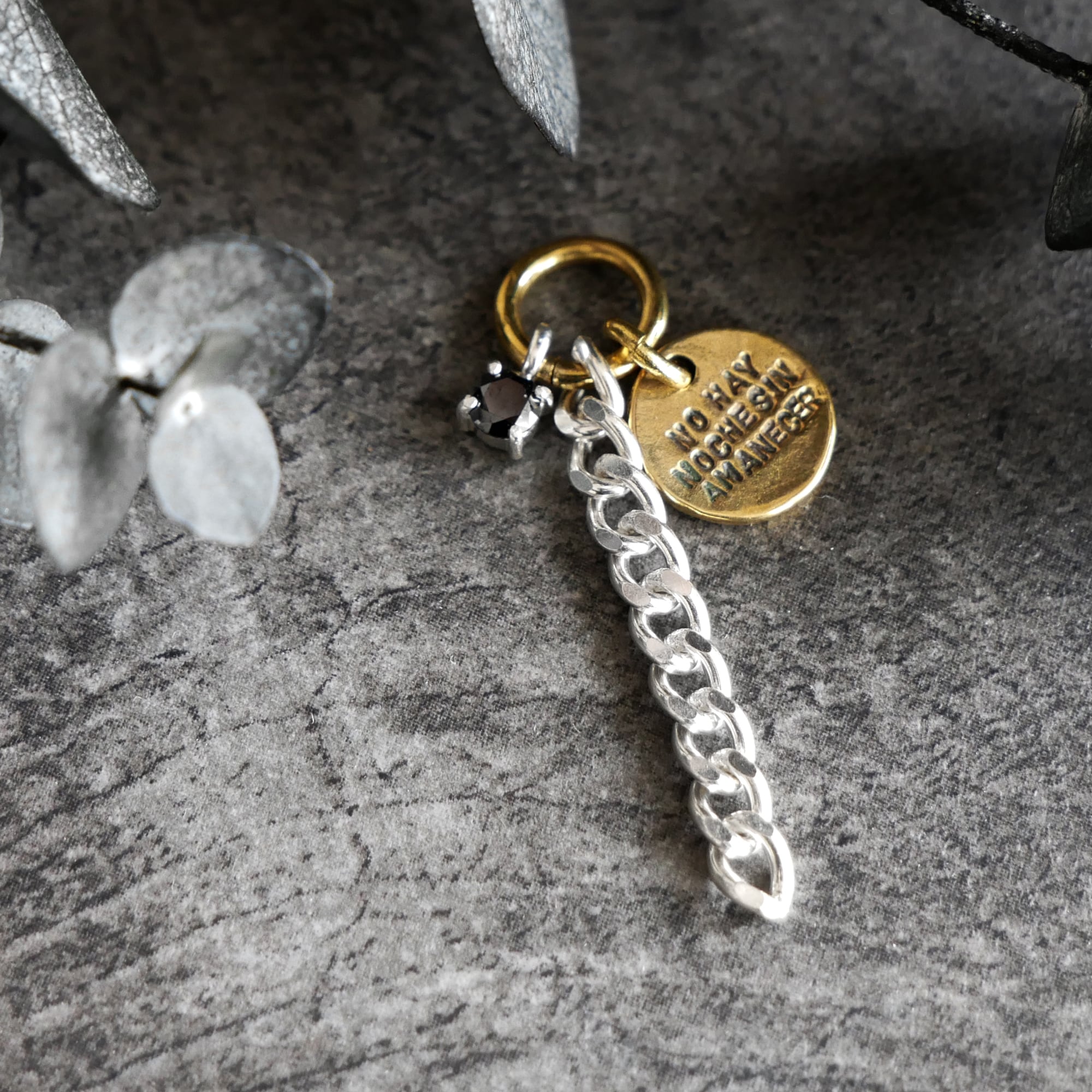 プレートとチェーン、ストーンを組み合わせたチャーム。異なる要素を重ねることで程よい存在感に仕上げました。