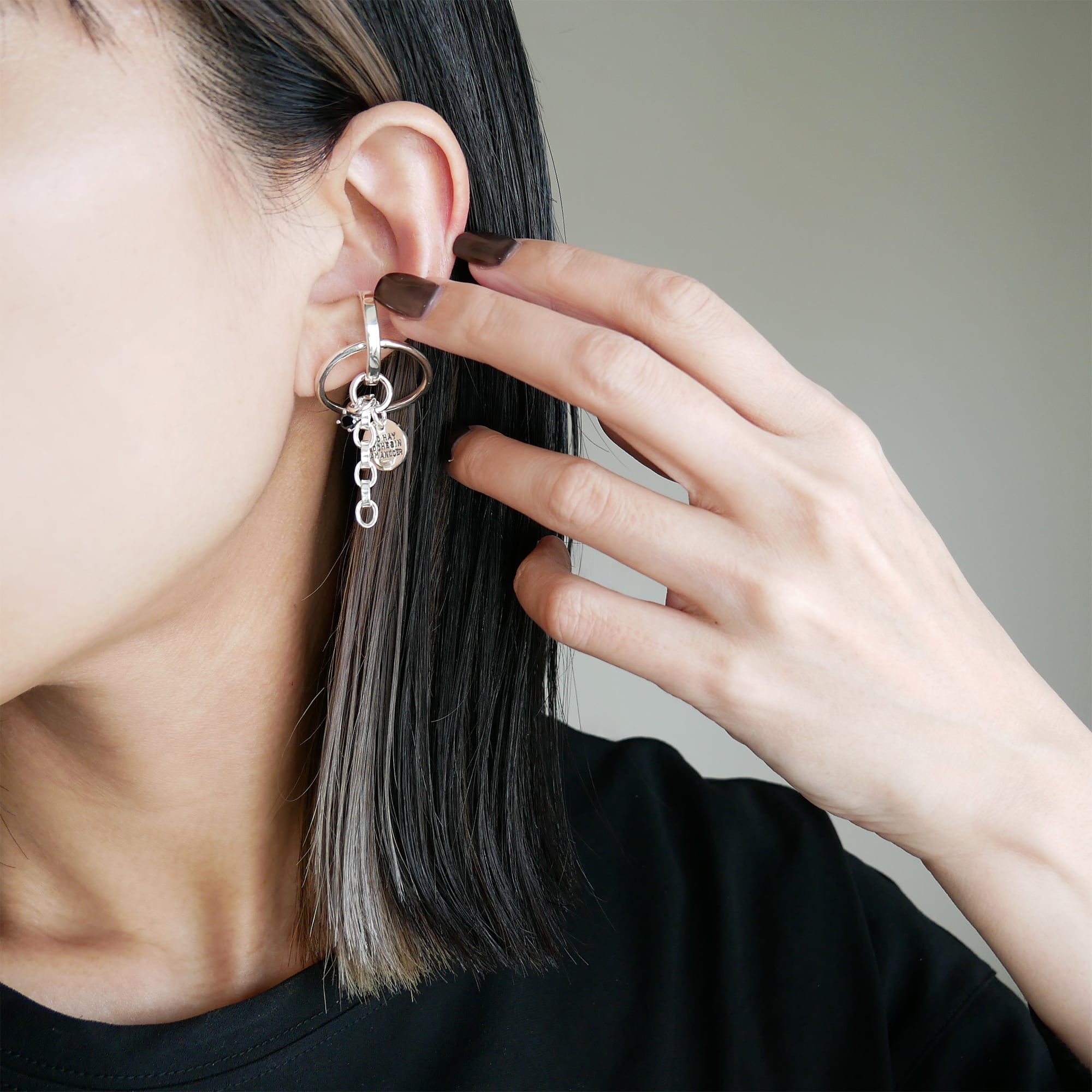 こちらは2種類の金具が付いている仕様で通す位置によってネックレスチャーム、イヤカフ用のチャームと2WAYでお使い頂ける便利なチャームです。